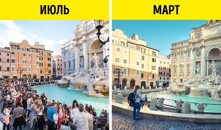 У великі туристичні міста варто приїжджати навесні. Так ви будете насолоджуватися містом в період цвітіння, але при цьому не застанете пік сезону і зумієте уникнути натовпів туристів у головних визначних пам'яток. При цьому потрібно враховувати географію міста: чим південніше, тим раніше можна їхати. У Мілані період цвітіння починається в кінці березня — початку квітня, а в Римі вже на початку березня все пахне.