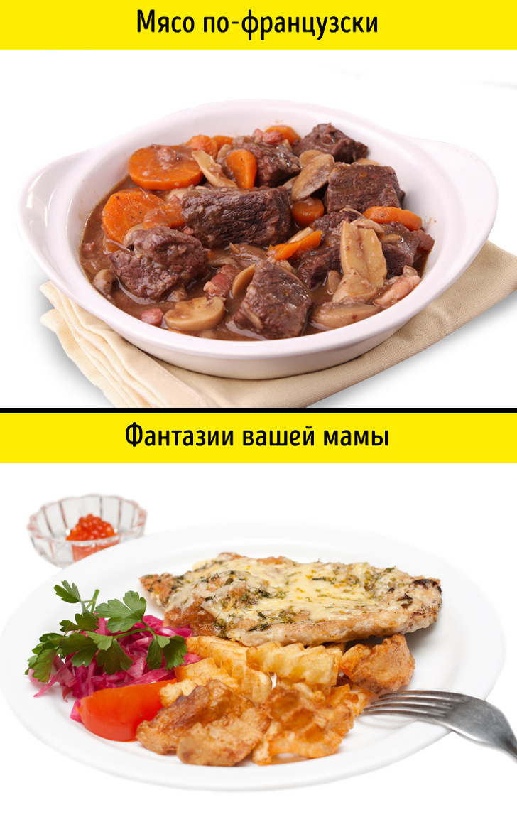 М'ясо «по-французьки» зазвичай з'являється на нашому столі у вигляді запеченої відбивною під шарами картоплі, майонезу і сиру. У Франції про такому способі приготування м'яса якщо і чули, то точно не під такою назвою. Самим французьким способом приготування м'яса по сей день залишається бет бургиньон (bœuf bourguignon) — яловичина в густому винному соусі, тушкована з овочами.