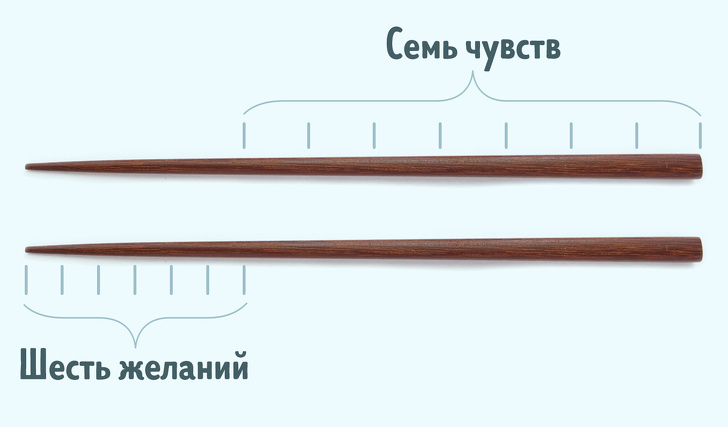 Навіть зовнішній вигляд палички говорить багато про що: вузький закруглений кінець — небо, а розширений квадратний — земля. Пальці, що знаходяться між двома паличками, позначають людство, яке живиться небом і землею. Але і це ще не все! Традиційна довжина палички — 7 китайських цунів (близько 23 см) і 6 феней (близько 2 см) — 7 почуттів і 6 мрій, описаних в буддійському богослов'ї.