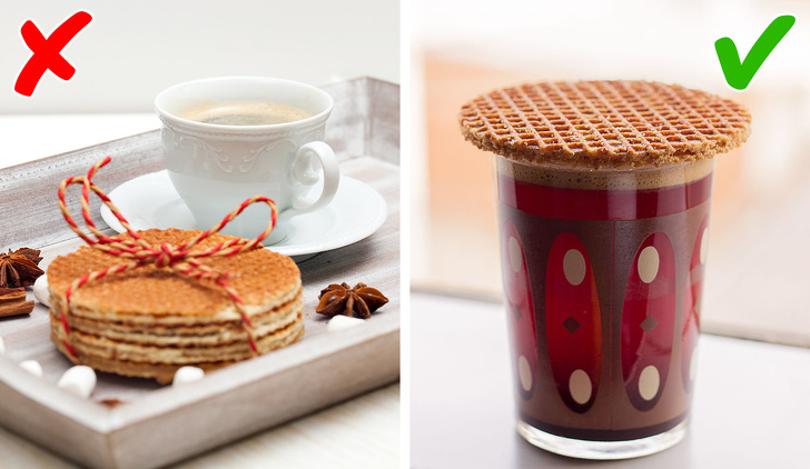 Стропвафли (Stroopwafel) — це голландські вафлі з 2 тонких шарів тіста, запечені з начинкою з карамельного сиропу. Їх можна знайти в будь-якому магазині у всьому світі, але мало хто знає, як їх правильно подавати. Голландці спочатку накривають ними кухоль з гарячим чаєм або кавою, щоб карамель всередині вафлі трохи розтанув, і тільки після цього ритуалу починають насолоджуватися десертом.