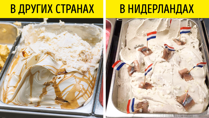 Оселедець — це улюблені ласощі в Нідерландах, і її можна зустріти в якості інгредієнта в абсолютно різних стравах. Однак навіть місцеві жителі знаходять поєднання цієї солоної риби з морозивом трохи дивним, але цілком їстівним.