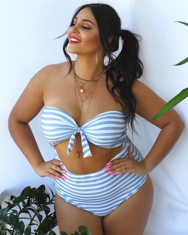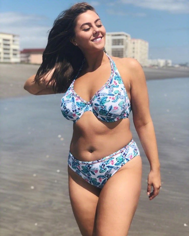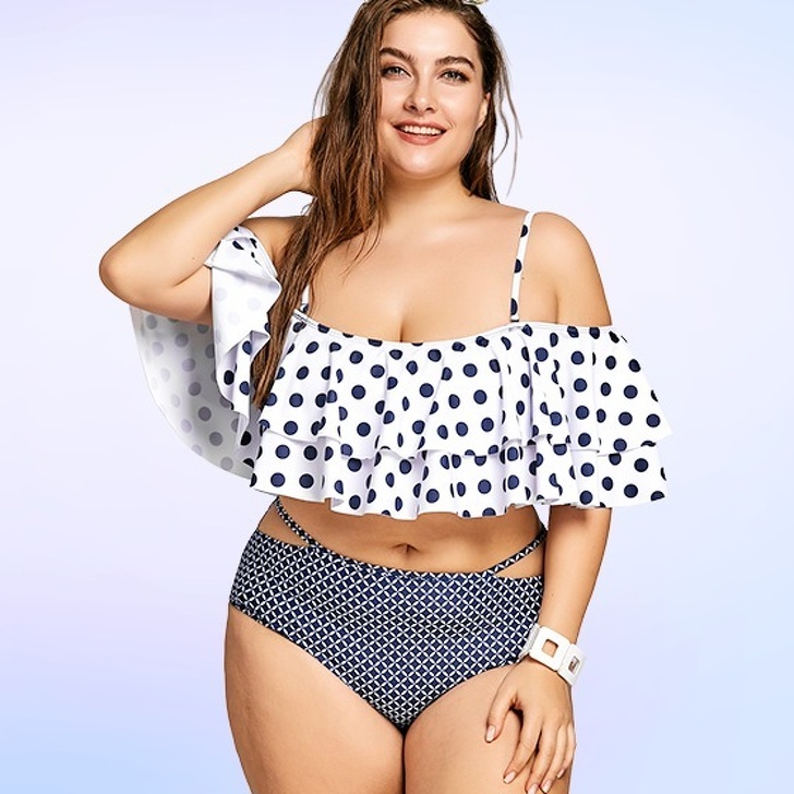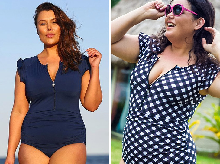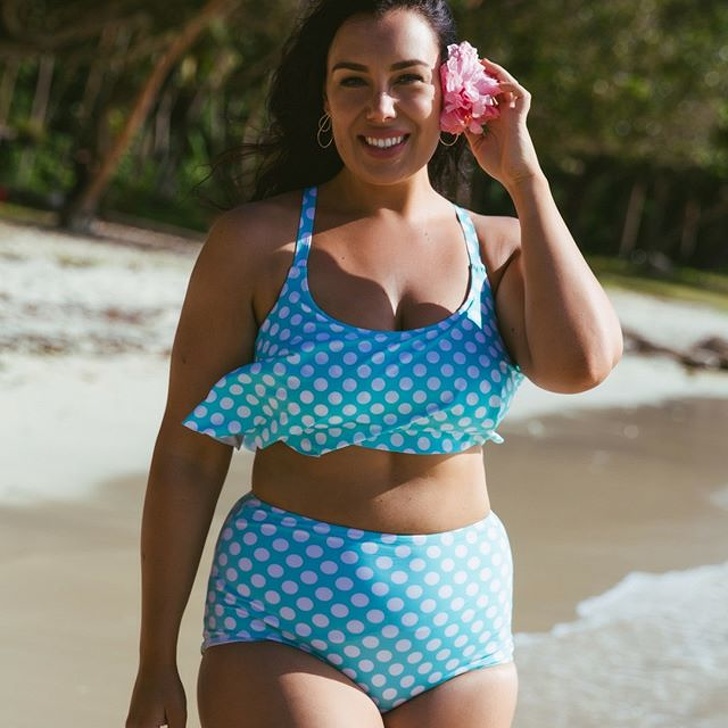 Якщо у вас виражена талія, а зайва вага розподіляється на груди і стегна, ви можете надіти практично будь-який купальник. Наприклад, добре виглядати буде просте бікіні із завищеною талією.