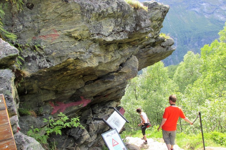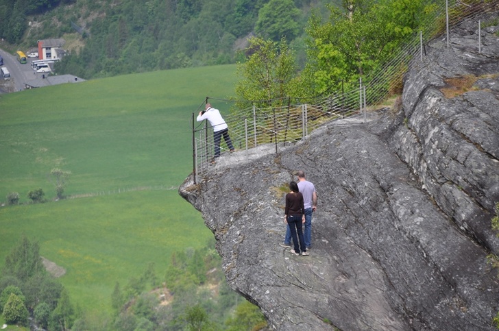 Скеля на скелі Флюдалсьюве (Flydalsjuvet) нависає над Гейрангер-фіордом на висоті 307 м. Назва цього дивовижного місця дослівно перекладається як «політ над каньйоном». Кожен, хто приїжджає сюди, обов'язково робить екстремальну фотографію на краю обриву. Хоча тут і стоїть паркан, а також чимало заборонних табличок, але на ризикований знімок вирішуються багато.