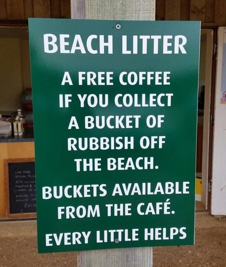 «Сміття на пляжі. Ми почастуємо вас чашкою кави, якщо винесете відро сміття з пляжу. Відра для сміття можна взяти в кафе. Навіть незначна допомога має значення».