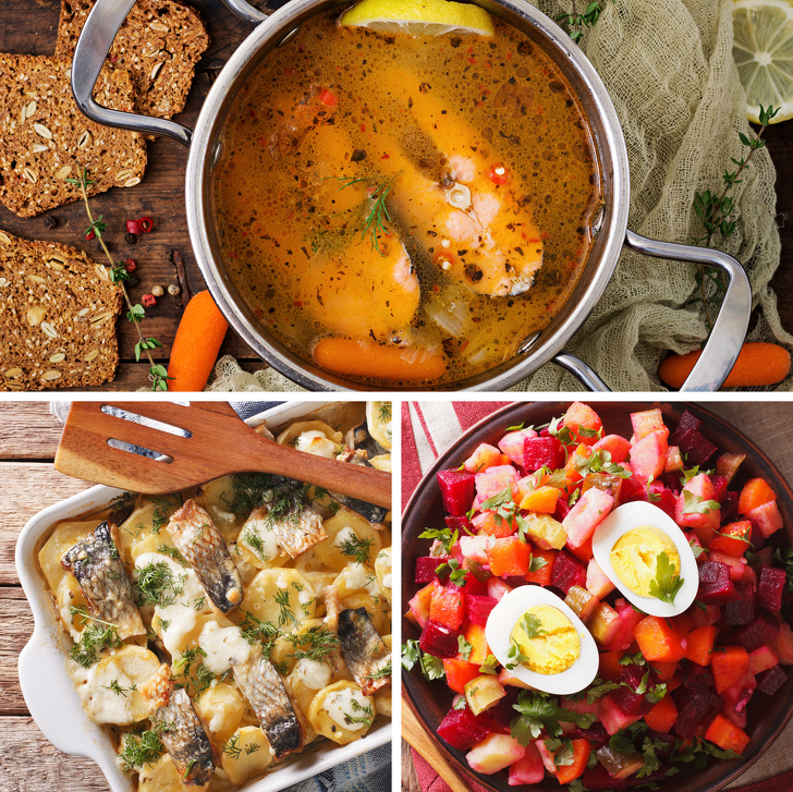 Всесвітньо відомі і поживні фінські супи, такі як суп з лосося з вершками або юшка з окуня або щуки. На перший погляд може здатися, що фіни їдять багато хліба, але так як він виготовляється з цільного зерна (пшениці, жита, вівса, ячменю), це цілком можна віднести до плюсів фінської кухні. І навіть фінські десерти (зазвичай це фруктові і ягідні супи муси) можна зі спокійною совістю назвати корисними.