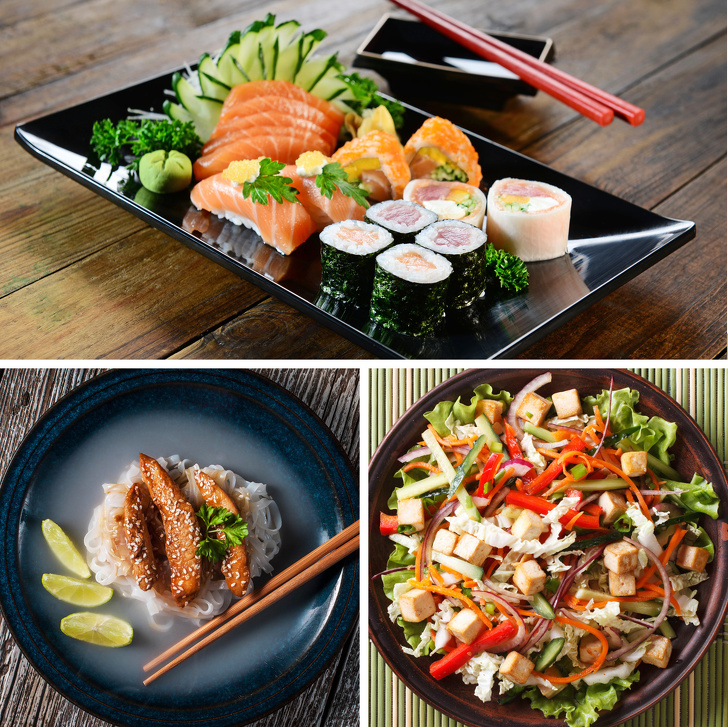 Основу японської кухні складають риба, водорості та інші морепродукти, а також овочі, соя і рис. М'ясо, молоко, тваринні жири і прості вуглеводи, навпаки, використовуються досить рідко. При цьому продукти піддаються мінімальній тепловій обробці, що дозволяє зберегти в них максимум корисних речовин. Навіть японські солодощі можна визнати еталонними з точки зору користі, адже їх готують з рисового борошна, фруктових соків і загусників, отриманих з водоростей.