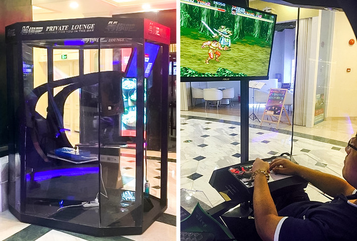 Всередині кабінки знаходиться зручне крісло, монітор і ігрова клавіатура з джойстиком, а в розпорядженні сотні 8-бітних ігор. Поки дружина займається шопінгом, чоловік може набрати їжі, напоїв і розслабитися в приємній обстановці. Також в Шанхаї можна зустріти схожі кабінки, тільки для двох, і замість ігор там караоке.