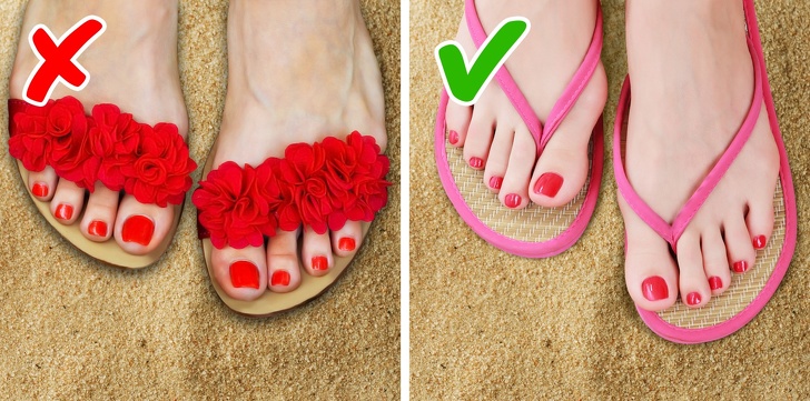 Пляжний взуття також має ілюзорною магією. Щоб ноги здавалися стрункішою і довше, можна віддати перевагу варіантам на танкетці з досить високим підйомом. Проте взуття з ремінцями, бантами і шнурівкою в області щиколоток краще уникати. Подібні елементи візуально «ріжуть» і вкорочують ноги. Поперечні перетинки на передній частині сандалій і босоніжках дозволяють візуально зменшити розмір ноги, а в'єтнамки і шльопанці з V-подібною перемичкою подовжують стопи, щиколотка при цьому може здаватися тонше.