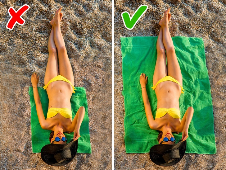 Рушник, на якому планується засмагати на пляжі, також володіє здатністю створювати візуальні ефекти. Щоб здаватися стрункішою, краще віддати перевагу широкого і довгого рушника великого розміру.