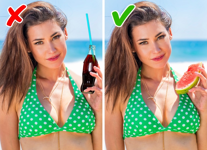 Щоб живіт залишався максимально плоским, слід, по-перше, не наїдатися щільно перед пляжем, по-друге, уникати продуктів, які можуть викликати здуття живота. До них відносяться, наприклад, горох, капуста, кукурудза, кренделі, крекери, ковбасні вироби, а також газовані напої і коктейлі на фруктових сиропах з льодом. Останні особливо привабливо виглядають в спекотний день, але ще одним недоліком є те, що з-за високого вмісту цукру вони дають організму швидкий заряд енергії, а потім так само швидко призводять до різкого її зниження, залишаючи відчуття втоми і знесиленості.