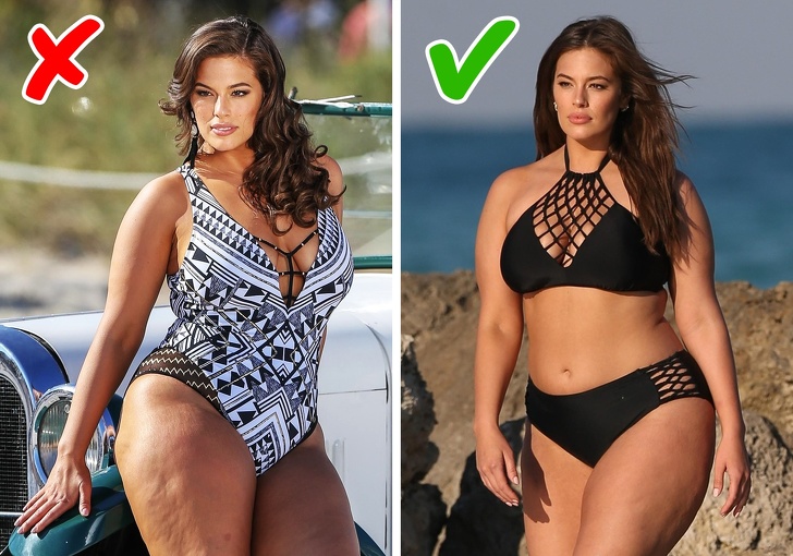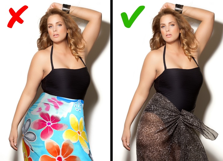 У спробах приховати зайве не варто зупиняти свій вибір тільки на слитных купальниках. До того ж при неправильно обраній забарвленням, наприклад великому малюнку, фігура, навпаки, може здаватися ще масивніше. При надмірно об'ємних стегнах варто зробити акцент на верхній частині тіла за допомогою ліфа з декоративними елементами.