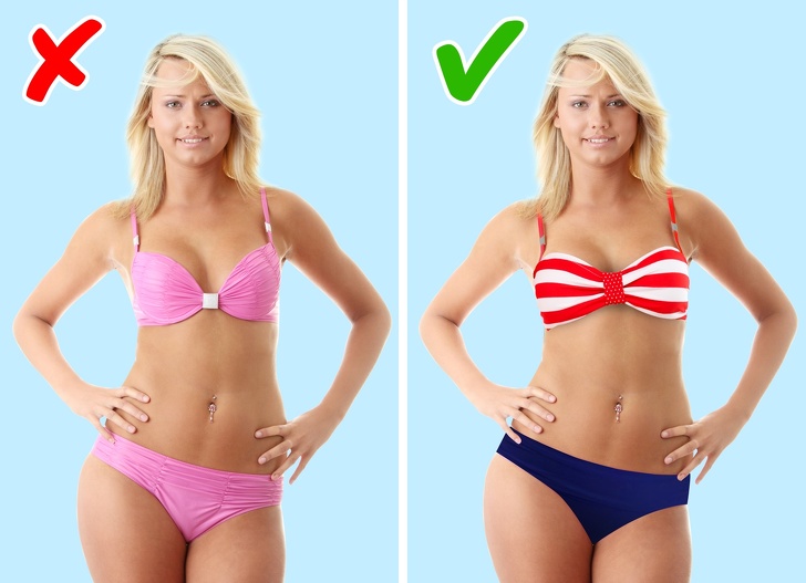 Крім того, для купальників, як і для будь-якого іншого одягу, діє прийом з горизонтальним малюнком, що додає об'єм, та вертикальним — витягує силует.