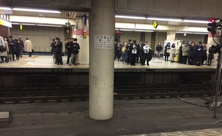 Це черга на поїзд в Токіо. Люди стоять в організованій черзі приблизно на рівні кожної відкривання дверей. Звичайно, про особистому просторі говорити не доводиться, але зате ніхто не лізе вперед тих, хто прийшов раніше.