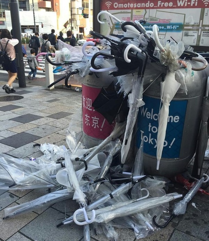 В Японії дуже популярні одноразові пластикові парасольки. Вартість їх досить низька, і можна не переживати із-за поломки. А погодні умови тут часто такі, що парасольки довго не живуть. Після сильних злив біля станцій метро часто можна побачити гори «використаних» пластикових парасольок.