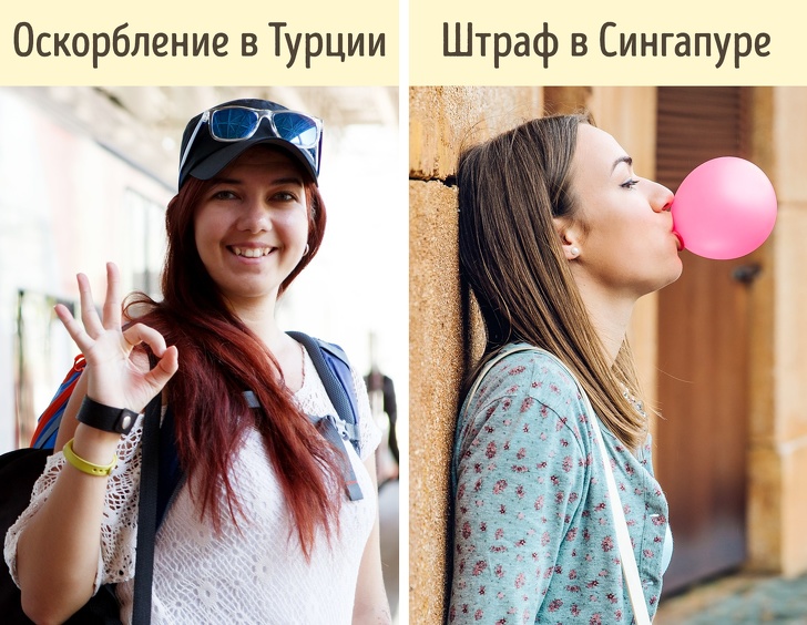 На перший погляд безневинний жест з двох складених пальців вважається вкрай вульгарним і образливим в Туреччині. У Сінгапурі за звичайну жувальну гумку або кинутий під ноги сміття можуть оштрафувати, а в арабських країнах ви будете почувати себе дуже ніяково, вбравшись в шорти і майку. Цих неприємних ситуацій можна з легкістю уникнути, якщо заздалегідь почитати туристичні сайти та форуми і ознайомитися з усіма особливостями і нюансами країни, куди ви прямуєте. Не забувайте, що в чужій країні ви в першу чергу гість і до місцевих традицій варто ставитися шанобливо.