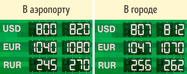 Як правило, курси валют в аеропорту набагато вище, ніж у місті. Тому після прибуття в нову країну простіше зняти національну валюту з картки або ж просто обміняти невелику суму, достатню для того, щоб дістатися до готелю.