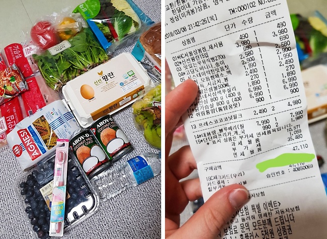 У супермаркетах і магазинах, як і скрізь, безліч звичних нам продуктів за прийнятними цінами. Підсумкова сума на чеку — в корейських вонах. 1 000 вон — це трохи більше 50 російських рублів і трохи менше $ 1. На чеку 47 110 он — це майже $ 50, або 2 500-3 000 рублів.