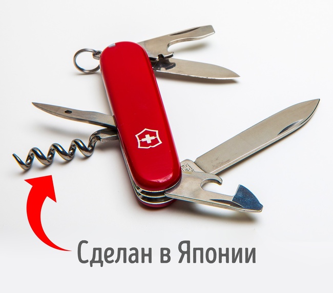 Єдина частина швейцарського ножа, яка проводиться не в Швейцарії, — це штопор. Його роблять у Японії.