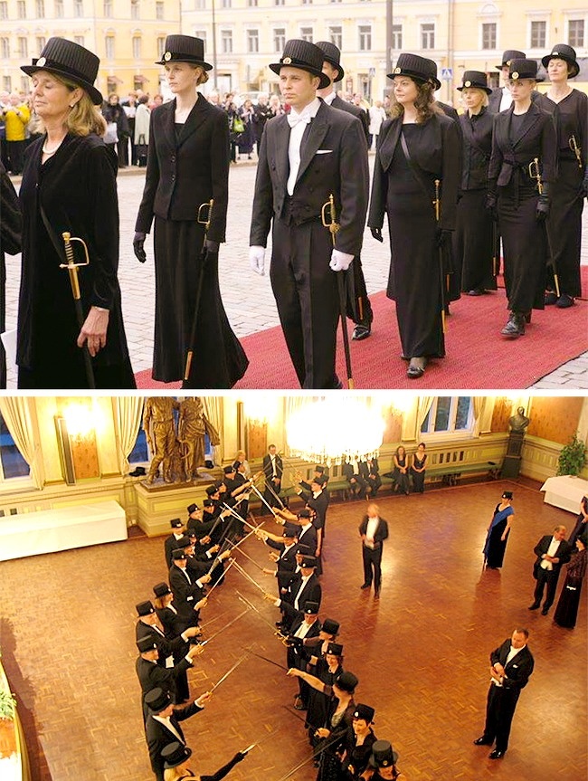 Під час отримання докторського ступеня в Фінляндії кожен вчений проходить обряд: на голову йому надягають докторську капелюх, а на руки дають справжній меч. Він символізує те, що новоспечений доктор наук готовий захищати істину, знання та добро. Не тільки захищати, але й викласти за меч круглу суму: і зброю, і капелюх вчені купують самі і приносять на церемонію з собою.