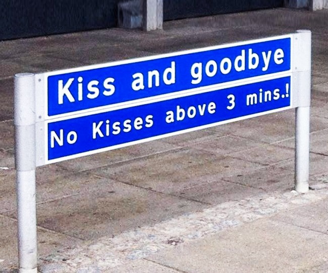 А ось ті, хто вже знайшов свою любов, дуже люблять влаштовувати довгі прощання в аеропорту, що заважає нормальним людям паркуватися. Аеропорт датського міста Ольборга став відомий на весь світ, коли встановив спеціальні знаки, щоб проводи не затягувалися. Це ж геніально, адже все, що написано на синьому тлі, відразу набуває особливої ваги в очах пішоходів. Цікаво, допомогла така міра?