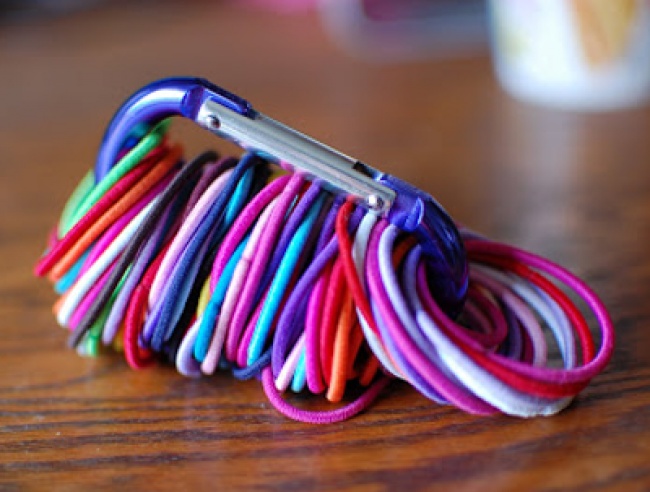 Гумки для волосся або грошей завжди можуть знадобитися в подорожі, оскільки з їх допомогою можна також пакувати речі, фіксувати скручені дроти або валики одягу. Щоб гумки не розсипалися і були завжди під рукою, можна надіти їх на карабін.
