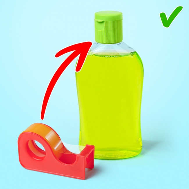 Щоб рідини і гелі не витікали з флаконів, можна заклеїти кришки липкою стрічкою.