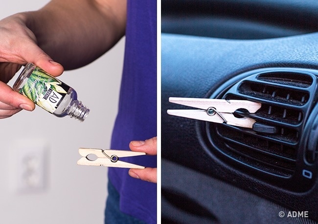 Щоб аромат в машині завжди був приємним і дарував вам гарний настрій, спробуйте нанести 5-10 крапель ефірного масла на прищіпку, а потім прикріпіть її до зручній поверхні. Підгледіли ось тут.