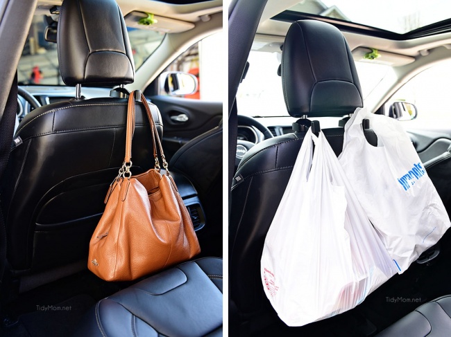 Щоб сумочки і пакети не займали сидіння для пасажирів і не розсипалося їх вміст, скористайтеся спеціальними пристосуваннями, які просто кріпляться до крісла. Або їх можна замінити карабінами. Подивитися можна ось тут.