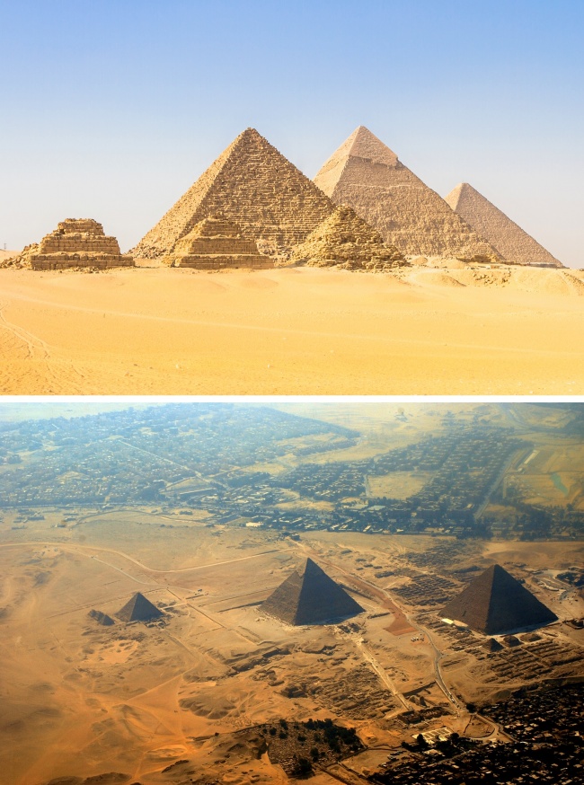 Представляючи собі єгипетські піраміди по книгах і фільмах, ми уверяемся, що вони стоять у безлюдній пустелі, овеваемые суворими вітрами. А насправді бідні райони Каїра підходять до них майже впритул, так що видовище відкривається не надто вражаюче.
