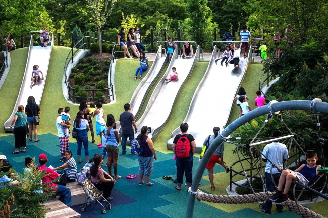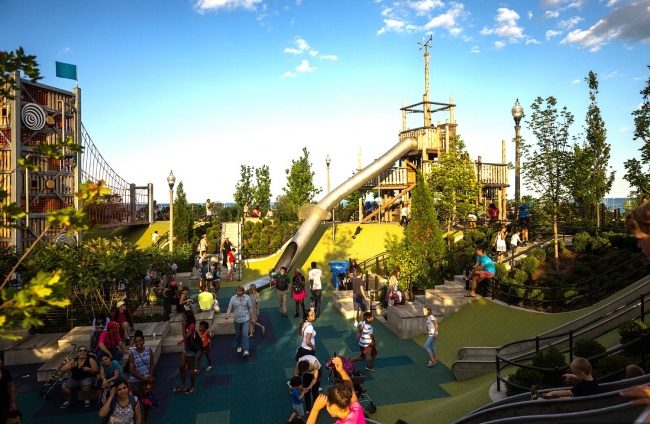 На газонах влаштовують пікніки, рослини висаджені для всіх сезонів. Наприклад, взимку в зоні скеледрому для старших дітей і дорослих заливають ковзанку (натисніть, щоб картинка ожила).