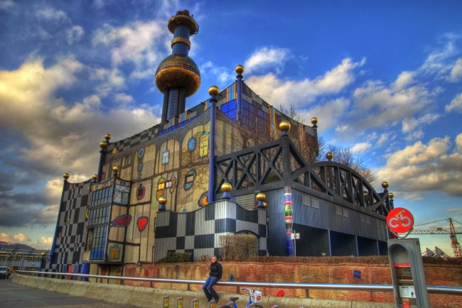 Сміттєспалювальний завод «Шпиттелау» — творіння Фріденсрайха Хундертвассера. Архітектор висунув ряд вимог, щоб завод у Відні викидав мінімум шкідливих речовин. І тільки коли переконався, що це можливо, приступив до проекту.