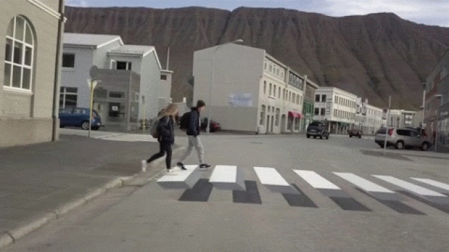 У Исафьордюре вирішили зробити більш ефективну розмітку для пішохідного переходу. Художники зробили звичайні смуги об'ємними. І настільки талановито, що з першого погляду всім здається, ніби їх підвісили в повітрі.