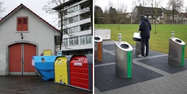 У Цюріху 43 % сміття переробляють. Для збору картону, металу, скла всюди стоять контейнери, є навіть надземні урни-бункери. Решта сміття викидають у білих пакетах по € 1,5. Всі зацікавлені, щоб цих пакетів було менше, і ретельніше сортують. Сміття спалюють, а отримана енергія йде на опалення 170 тис. будинків. При цьому дим проходить очищення і виходить з труб нешкідливим.