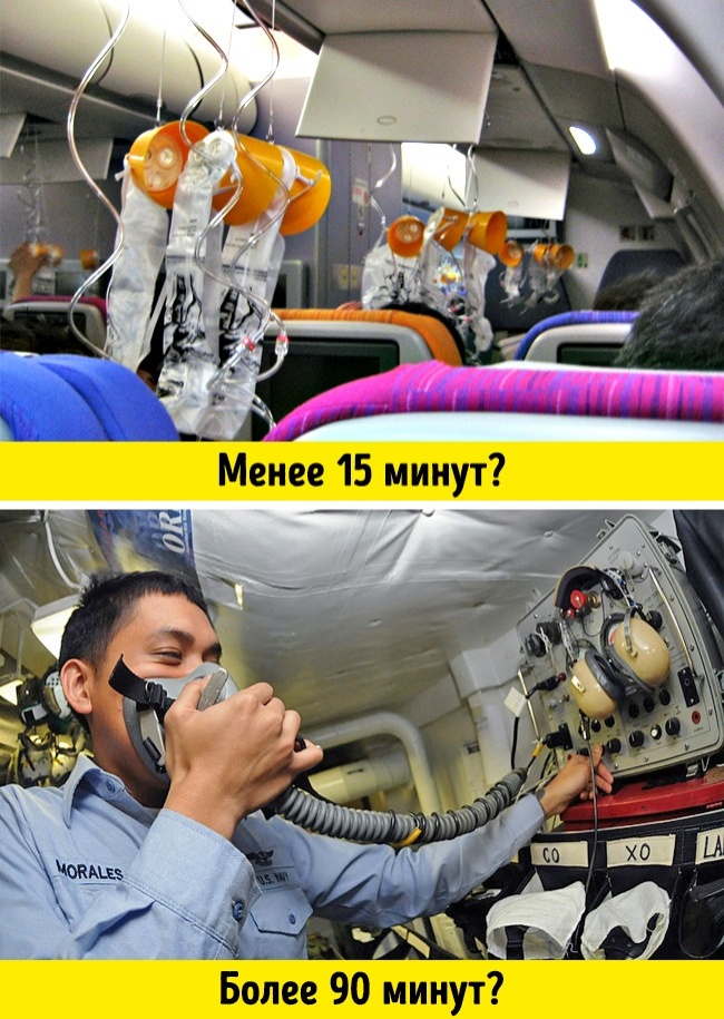 Кисневі маски для пасажирів розраховані на 10-15 хвилин. Цього часу достатньо, щоб пілот опустив літак на висоту, де можна нормально дихати. У пілота власна стаціонарна киснева маска, розрахована на більший час — щоб спустити і навіть посадити літак, не втрачаючи концентрації. Перед кожним польотом пілоти перевіряють працездатність своїх масок.