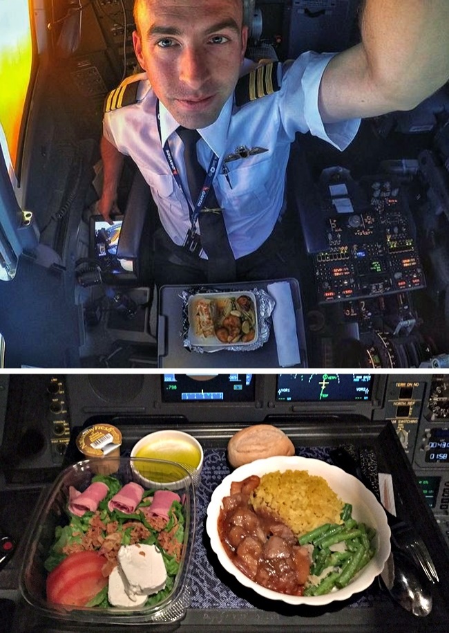 Для пілотів готують окреме меню з кількома стравами на вибір: якщо командир захоче курку, то другому пілотові дістанеться на обід риба або м'ясо. Це кращий спосіб уникнути отруєння однаковими продуктами. Пілоти харчуються по черзі, деякі прямо за штурвалом за спеціальними столиками.