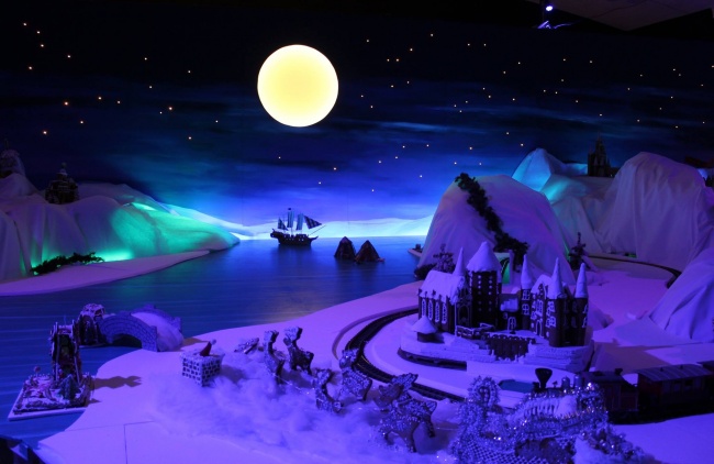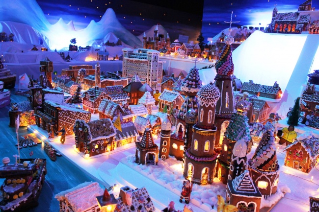 Тут можна помилуватися не тільки пряниковими будівлями всіх видів: між імбирних берегів тече річка з ароматними корабликами, а по вулицях їдуть їстівні автомобілі. А от залізниця і літак уже не з пряників, зате поїзд регулярно відправляється в шлях.