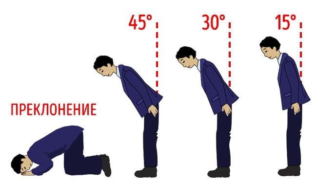 - найвищий шанобливий уклін («сайкэйрэй»), 45° — так варто кланятися, якщо ви вибачаєтесь або побачили імператора;