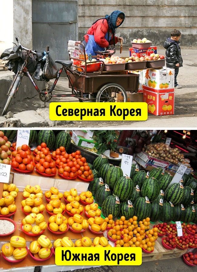 Голоду в КНДР немає, але брак фруктів і овочів ніяк не можна відшкодувати, тому всі їдять яблука і капусту. Недолік білкової їжі також позначається: кажуть, саме з-за цього сіверяни нижче південців. Щоб хоч якось покрити цю потребу, вони розводять жаб та черепах.. Ще на вулиці Пхеньяну торгують сосисками на паличці, паровими пиріжками, місцевим морозивом та попкорном. На півдні ж в ходу крім традиційної також і безмежна європейська кухня.