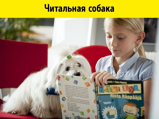 У фінських бібліотеках працюють спеціально навчені «читальні» собаки, які прищеплюють дітям любов до читання: вони слухають, як хлопці читають їм книжки або розповідають історії.