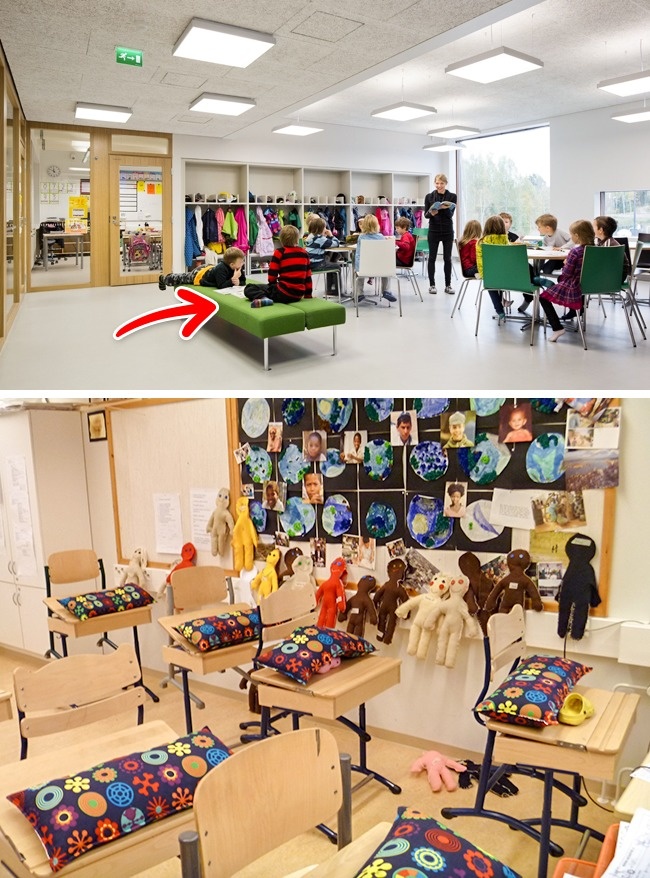 Діти тут не сидіти за партою. Під час уроку вони можуть розташуватися в кріслах або прямо на підлозі. У теплу погоду уроки проводять на свіжому повітрі, на травичці біля школи або на спеціальних лавках, розташованих амфітеатром.