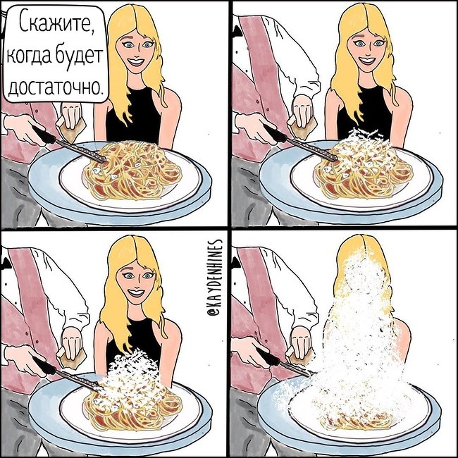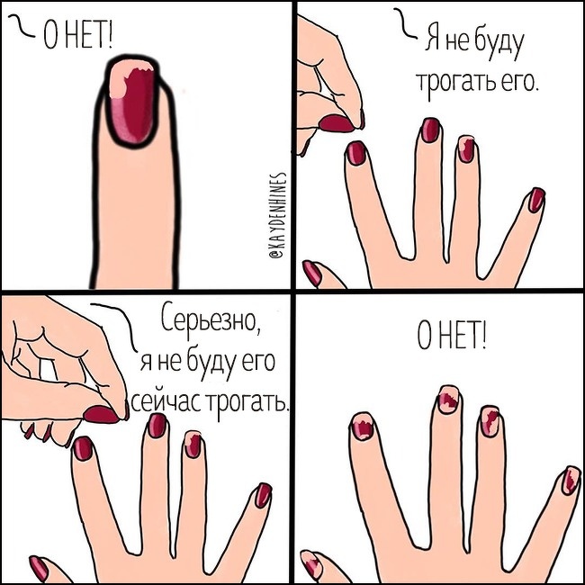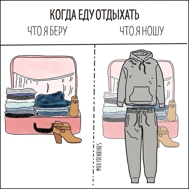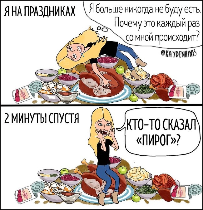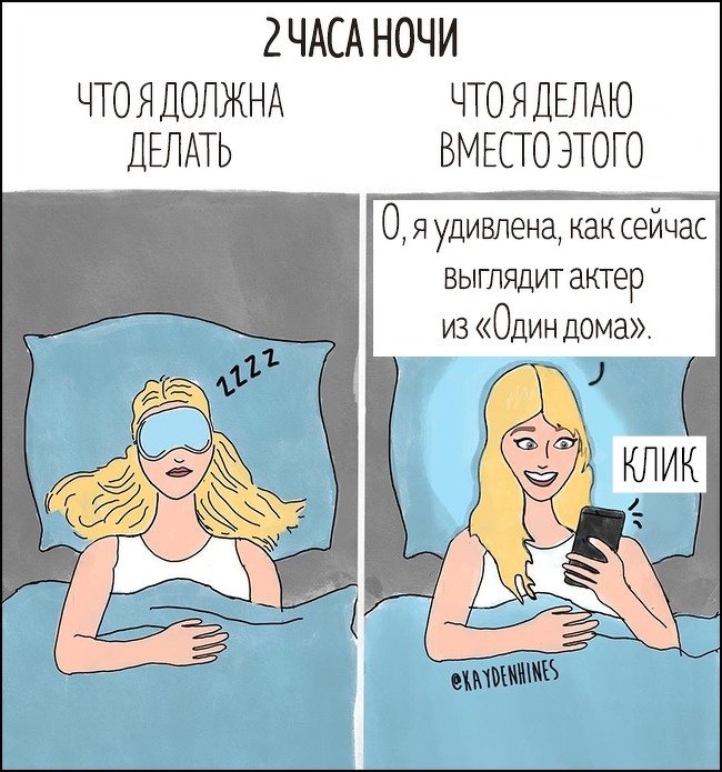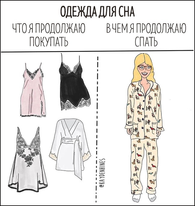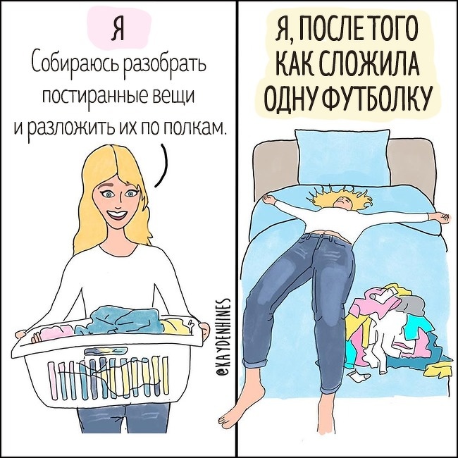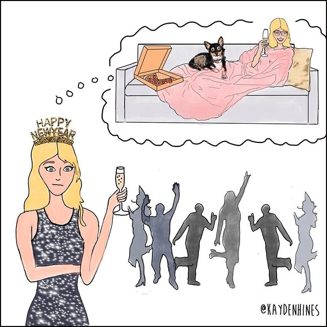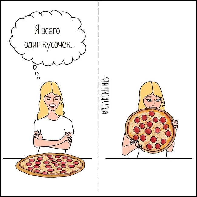 Каліфорнійська художниця Кейден Хайнс (Kayden Hines) малює себе в кумедні ситуації, в які потрапляла будь-яка дівчина. Холодна піца, гаряче серце — ось як у двох словах вона описує себе в инстаграме. А ми б додали ще гарне почуття гумору, тому що кожна картинка викликає посмішку.