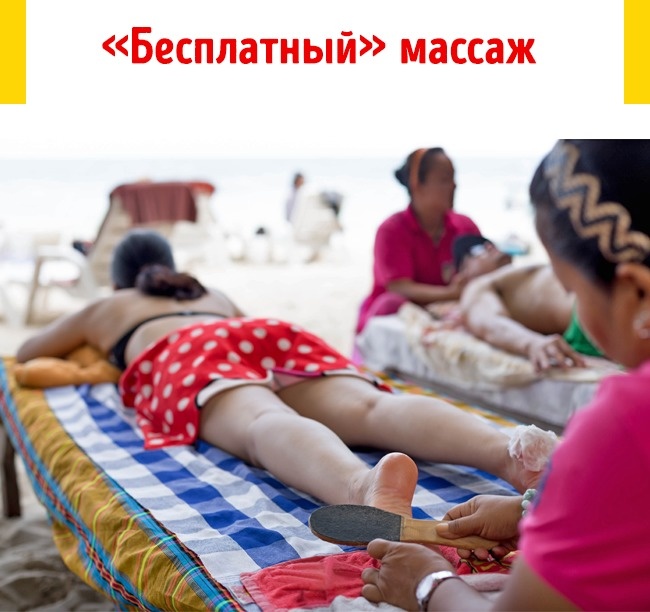 Поки ви вивалюєтесь під сонцем, до вас підійде жінка і запропонує масаж (манікюр, педикюр) в подарунок. По закінченні процедур ви дізнаєтеся, що всі процедури платні, і ціна їх раз на 5 вище, ніж у міських салонах.