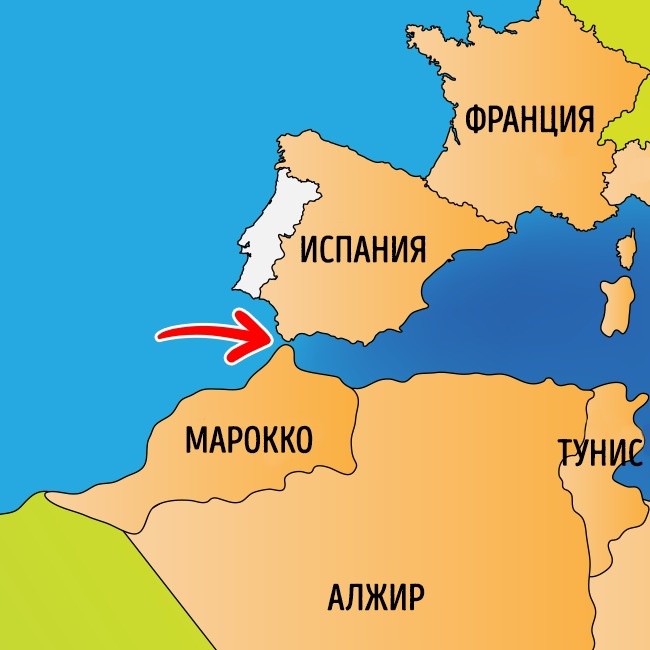 Гібралтарська протока відокремлює Марокко від Європи, всього на 16 км. Стоячи на березі Марокко, можна спостерігати за рухом машин в Іспанії. А два іспанських анклаву, Сеута і Мелілья, розташувалися на території самого королівства. Так що можна потрапити в Європу, не залишаючи Марокко.