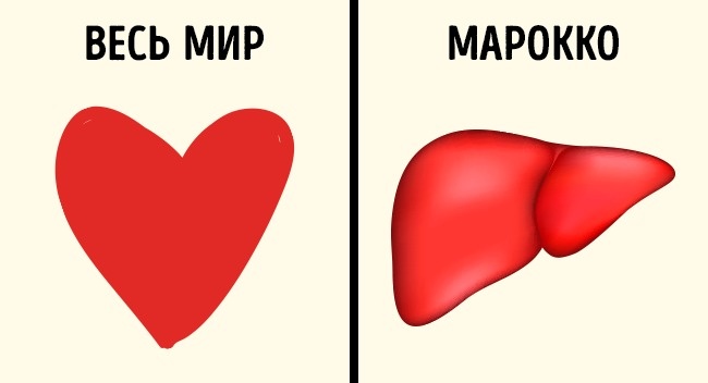 Символом любові в Марокко є не серце, як ми звикли, а печінку. Вважають, що здорова печінка допомагає травленню і сприяє благополуччю. Фраза «ви підкорили мою печінку» означає визнання в любові.