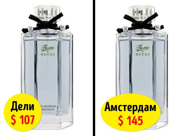 Flora by Gucci коштують $ 119 на офіційному сайті, $ 145 в амстердамському аеропорту і всього $ 107 в Делі.