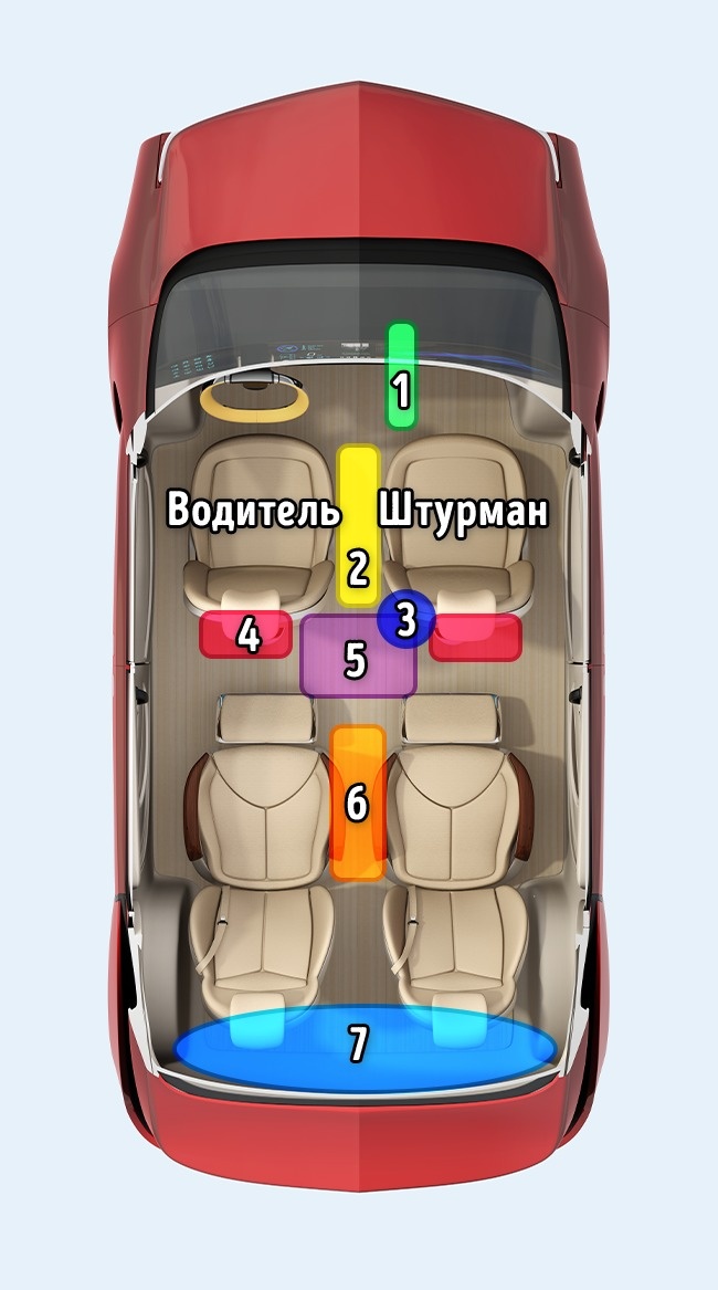 1 — те, що постійно потрібно водієві і штурману (гаманець, окуляри);