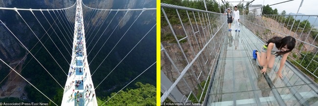 Найдовший скляний міст у світі, довжина якого становить 430 метрів, а відстань до землі — 300 метрів. З'єднує два гірські кручі в національному парку Чжанцзяцзе, де проходили зйомки фільму «Аватар».