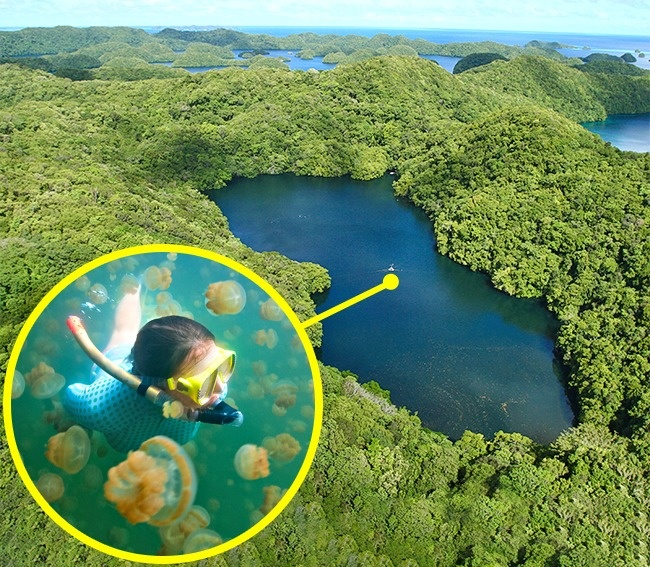 Озеро розташовується в архіпелазі Скелясті острови (Палау) і відомо відокремленої популяцією двох видів медуз — золотий (Mastigias papua) та місячної (Aurelia). Через відсутність багатьох природних ворогів медузи розмножилися до 2 млн особин. Крім того, щупальця медуз втратили жалкі клітини (які відповідають за поразку ворога або харчового об'єкта), тому це озеро так люблять дайвери і туристи.