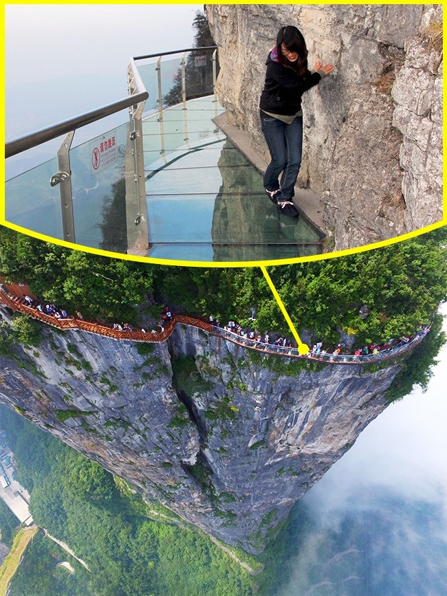 Міст в китайській провінції Хунань, по якому можна пройти над прірвою по прозорому підлозі. Стежку назвали «Звивистий дракон» і вона обвиває гору на висоті приблизно 1,5 кілометра. З мосту відкривається вид на дорогу з 99 вигинами.