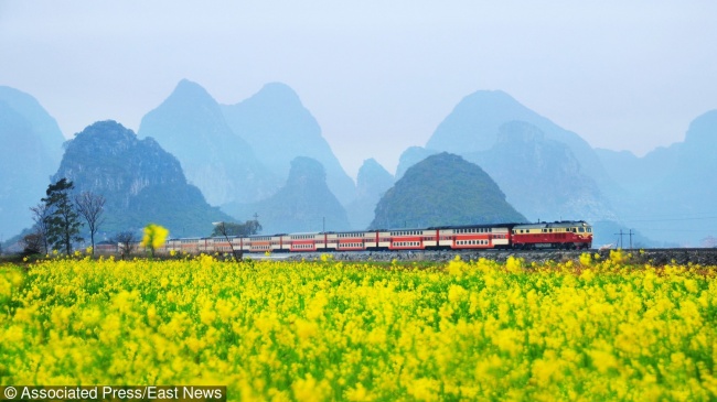 Пасажирський поїзд серед квітучого ріпаку, околиці міста Гуйлінь